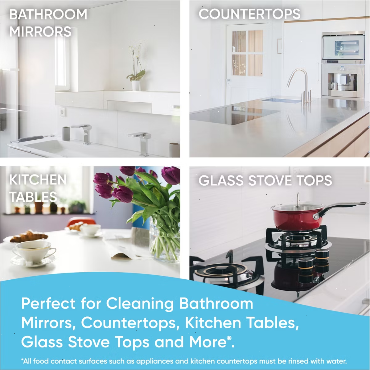USES: WHERE TO USE: Bathroom surfaces, bathroom mirrors, glass shower doors, countertops, glass frames & décor, glass stove tops, kitchen tables, glass microwave doors**.